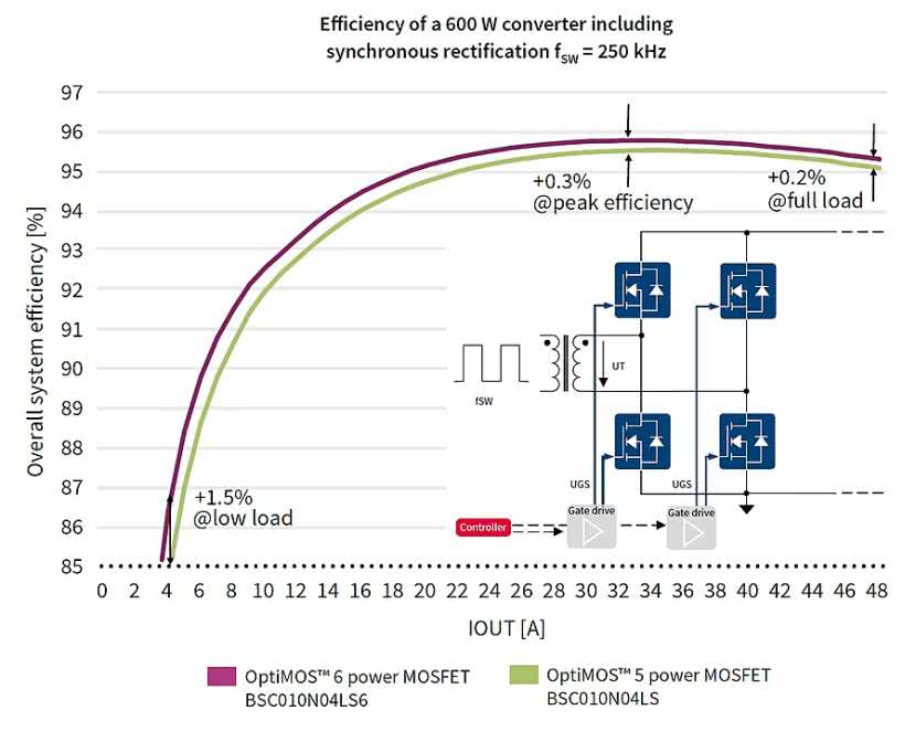 Krzywe sprawności energetycznej pokazują wyraźnie, że tranzystory OptiMOS 6 wykazują znacznie mniejsze straty w zakresie małych mocy wyjściowych od tranzystorów poprzedniej generacji. Pozostają one na niskim poziomie również przy dużych obciążeniach pomimo, że dominujące są w tym zakresie straty na przewodzenie, uzależnione od RDS(on). Zapewnia to mniejsze wymogi odnośnie układu chłodzenia oraz ułatwia łączenie równoległe tranzystorów, co w konsekwencji oznacza niższe koszty realizacji zasilacza.
