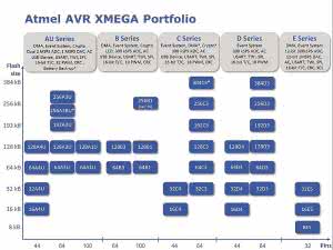 - AVR Xmega z pamięcią Flash o pojemności od 8 do 384 kB, w obudowach od 32-100 pinów.