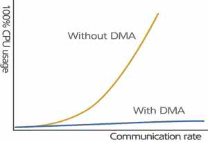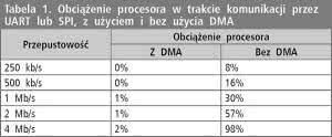 Kontroler DMA (Direct Memory Access) umożliwia szybki transfer danych pomiędzy peryferiami i pamięcią, bez obciążania CPU. Rezultat zastosowania DMA przedstawiono na rysunku 3 oraz umieszczono w tabeli 1.