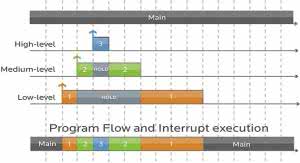 Wielopoziomowy kontroler przerwań (Multi-level Interrupt Controller) umożliwia nadawanie przerwaniom jednego z trzech dostępnych priorytetów. Przerwania o wyższym priorytecie realizowane są przed tymi o niższym. Mechanizm ten daje programiście wiele możliwości realizacji różnego rodzaju scenariuszy działania układu. Wprowadzenie wielopoziomowego kontrolera przerwań jest przykładem reakcji producenta na potrzeby klientów, którym brak możliwości nadawania priorytetów przerwań utrudniał dotąd pracę z układami z rodziny ATmega. Działanie kontrolera pokazano na rysunku 5.