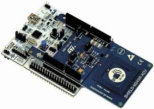 Pierwszy z nich - o nazwie X-NUCLEONFC01A1 (fotografia 3) - wyposażono w nieulotną pamięć EEPROM-NFC z serii M24SR (zgodną z NFC Forum Tag Type 4). Pamięć ta jest także wyposażona w standardowy, przewodowy interfejs I²C. Komunikacja z pamięcią jest możliwa przez obydwa interfejsy komunikacyjne, radiowy tor NFC (Near Field Communication) pracuje w pasmie radiowym 13,56 MHz. Ekspander wyposażono w antenę RFID wykonaną na PCB, która zapewnia komunikację pomiędzy pamięcią M24SR i smartfonem lub czytnikiem NFC/RFID oraz trzy diody LED do wykorzystania w aplikacji użytkownika.