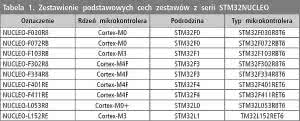 Zabieg ten spowodował, że płytki drukowane zestawów STM32NUCLEO wyglądają tak samo, niezależnie od typu zastosowanego mikrokontrolera, a ich identyfikację umożliwiają naklejki umieszczone jak pokazano na fotografii 1. Ujednolicenie sprzętu przez producenta ułatwia użytkownikom - w razie takiej potrzeby - wymianę mikrokontrolera na inny typ, co jest o tyle istotne, że pośród dostępnych obecnie 9 typów zestawów NUCLEO (zestawiono je w tabeli 1).