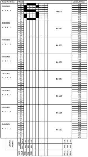 Położenie linijki w poziomie określa licznik kolumn zmieniający się w zakresie 0...131, a położenie w pionie określa licznik stron zmienia się w zakresie 0...7. Po ustaleniu numeru strony kolejne zapisywane bajty tworzą pasek o szerokości 8 pikseli. Każdy zapis danej powoduje inkrementację licznika kolumn i nowa dana jest zapisywana po kolejna lokację. Kiedy licznik kolumn osiągnie wartość 131, to po następnym zapisie danych jest zerowany.