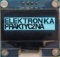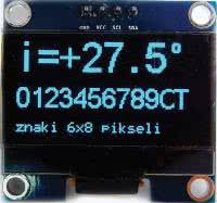 Zasada wyświetlania dużych znaków jest identyczna z tym, że wysyłane są bajty wzorca w trzech porcjach po 15 bajtów. Na fotografii 6 pokazano ekran z wyświetlonymi znakami o 3 różnych wielkościach, od największej do najmniejszej. Nawet przy tak małym wyświetlaczu i ustawieniu kontrastu na średnią wartość duże znaki są dobrze widoczne i czytelne z odległości około 2 metrów. To zapewne zasługa technologii OLED, bo trudno byłoby uzyskać taki efekt z wyświetlaczem LCD o identycznych wymiarach.