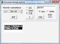 Tak przygotowaną bitmapę trzeba następnie przekonwertować do tablicy w języku C. Tutaj jest niezbędne zastosowanie specjalnego programu, który potrafi to zrobić zgodnie z zasadą powiązania zawartości pamięci programu z wyświetlanymi pikselami na matrycy - ja użyłem bmp2c.exe. Po wczytaniu bitmapy, zaznaczeniu opcji V-8 i kliknięciu na przycisk "C", program generuje tablicę w języku C i umieszcza ją w schowku systemu Windows.