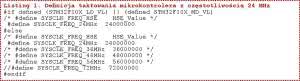 Po krótkim przetestowaniu procedur z tej noty postanowiłem zastosować je do sterowania wyświetlaczem. Projekt przykładowy jest skonfigurowany dla taktowania z częstotliwością 72 MHz, natomiast rdzeń zastosowanego mikrokontrolera może pracować z maksymalną częstotliwością taktowania 24 MHz. Jeżeli tego nie zmienimy, to mikrokontroler nie będzie działał. Predefiniowane ustawienia taktowania są umieszone w pliku system_stm32f10x.c, którego zawartość pokazano na listingu 1.