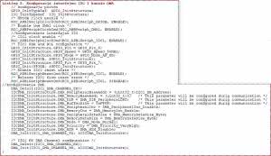 Przed użyciem moduł I²C musi być zainicjowany. Pierwsza cześć inicjacji dotyczy konfigurowania linii portów dla sygnałów SDA i SCL, druga część, to konfiguracja samego modułu I²C, a trzecia opcjonalnie konfiguruje kanał DMA - listing 2.