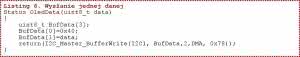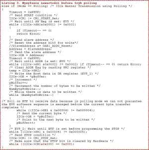 Na listingu 3 pokazano procedurę wysyłania zawartości bufora w trybie polling. W pierwszej kolejności jest inicjowana sekwencja Start. Zakończenie tej sekwencji jest sygnalizowane przez wyzerowanie bitu SB - zdarzenie EV5 (rysunek 4). Jeżeli sekwencja Start nie zakończy się w określonym czasie, to procedura kończy działanie i zwraca koda błędu.
