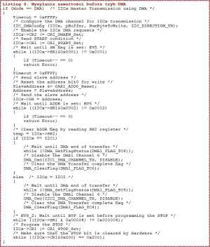 Po sekwencji Start jest wysyłany adres slave przez zapisanie jego wartości do rejestru DR. Wysłanie adresu i odebranie bitu potwierdzenia A jest sygnalizowane ustawieniem bitu ADDR. Jeżeli wszystko przebiega poprawnie, to można zapisywać w pętli kolejne dane do rejestru DR. Wysłanie kompletnej danej jest sygnalizowane ustawieniem bitu TxE. Na listingu 4 pokazano procedurę wysyłania zawartości bufora z wykorzystaniem kanału DMA.