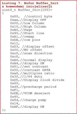 Ponieważ część komend wymaga oprócz samej komendy dodatkowego argumentu, to nie użyłem do inicjowania funkcji OledCmd, tylko wszystkie bajty komend inicjalizacji łącznie z niezbędnymi argumentami umieściłem w buforze Buffer_Init. Zawartość bufora z pierwszym bajtem kontrolnym 0x80 jest wysyłana do sterownika wyświetlacza za pomocą funkcji I²C_Master_BufferWrite. Zawartość tego bufora pokazano na listingu 7.
