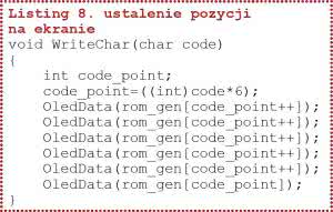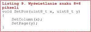 W czasie testów wyświetlacza najpierw wykorzystałem tablicę z wzorcami znaków 8×6 pikseli stosowaną przeze mnie przy wyświetlaniu tekstów na monochromatycznym wyświetlaczu LCD od telefonu komórkowego Nokia 3310. Przy używanym w sterowniku trybie adresowania wystarczy ustawić adres kolumny i numer strony (listing 8) i wysłać do sterownika kolejnych 6 bajtów (listing 9).