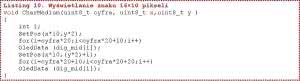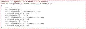 Dodatkowo, można zdefiniować tablicę wzorca tylko dla wybranych znaków. Ze względów praktycznych (zajętość pamięci Flash) zdefiniowałem tablicę znaków (głównie cyfr) dla symboli "średnich" o wielkości będącej wielokrotnością 8 pikseli (1 bajta), wysokości 16 pikseli (2 bajty) i szerokości 10 pikseli oraz "dużych" o wysokości 24 pikseli (3 bajty) i szerokości 15 pikseli. Procedurę wyświetlania symboli "średnich" pokazano na listingu 10, a "dużych" na listingu 11.