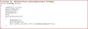 Funkcję OledBmp można zoptymalizować czasowo. Każdy bajt z tablicy bitmapy jest wysyłany do sterownika wyświetlacza przez funkcję OledData, Jak już wspomniałem, wymaga to wysłania adresu slave, bajta kontrolnego i bajta danej. Nie jest zbyt optymalne czasowo, ale w trakcie testów okazało się, że użyty mikrokontroler i jego interfejs I²C wysyła dane na tyle szybko, że bitmapa ładuje się bez widocznego migotania.