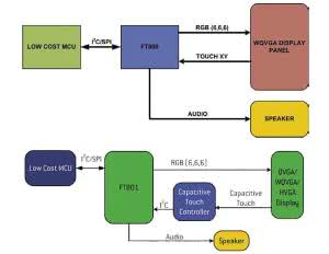 Układ FT801 - w wersjach z ekranem pojemnościowym, również z wielodotykiem. Ponadto układ FT801 jest w pełni kompatybilny z FT800, a to za sprawą możliwości wyboru trybu pracy. W trybie kompatybilności obsługuje tylko pojedyncze punkty dotyku, dzięki czemu może udawać układ FT800, pomimo podłączenia do ekranu pojemnościowego. W trybie rozszerzonym jest obsługiwane do 5 punktów dotyku. Schematy połączenia obu układów zostały pokazane na rysunku 1, a schemat blokowy FT801 zilustrowano na rysunku 2.