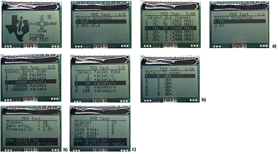 Mikrokontroler CC2650 ma fabrycznie zapisaną w pamięci aplikację testową służącą do pomiaru jakości i zasięgu sygnału radiowego. Jest ona uruchamiana natychmiast po załączeniu zasilania. Wówczas jeden kompletów (SFR06EB+CC2650EM) należy skonfigurować w roli nadajnika, natomiast drugi odbiornika. Wybieramy protokół radiowy (Bluetooth Low Power BLE lub IEEE 802.15.4) i kanał transmisji radiowej.