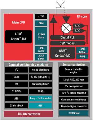 Dodatkowo, w mikrokontrolerze CC2650 zaimplementowano energooszczędny kontroler czujników (prawdopodobnie wykorzystano przy tym rdzeń mikrokontrolera MSP430). Współpracuje on z głównym rdzeniem mikrokontrolera CC2650 i jest wykorzystywany w trybach oszczędzania energii. Schemat blokowy CC2650 pokazano na rysunku 5. Parametry mikrokontrolera umieszczono w tabeli 1.