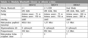 W wersji klasycznej nadal głównym założeniem aplikacyjnym jest przesyłanie dużych ilości informacji (pliki, audio itp.) i kontrola tych transmisji, nawet kosztem poboru mocy i czasu nawiązania połączenia (moduły Bluetooth Classic z oferty u-blox wymieniono w tabeli 1). W BLE najistotniejszy jest niski pobór mocy, a w rzeczywistości długi czas działania, osiągnięty za pomocą bardzo krótkiego czasu potrzebnego do nawiązania połączenia (rzędu milisekund), założenia wysyłania krótkich pakietów i trybowi uśpienia, w którym moduł ma przebywać przez większość czasu.