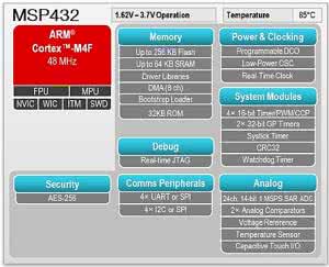 Osoby używające mikrokontrolera MSP430 na pewno rozpoznają niektóre bloki funkcjonalne dostępne w MSP432, ponieważ przeniesiono je z tego mikrokontrolera (rysunek 2) włączając w to bibliotekę sterowników urządzeń I/O, zegar czasu rzeczywistego, timer/generator przebiegu PWM, timer Watchdog, interfejs JTAG, jednostkę szyfrującą zgodnie z algorytmem AES-256, interfejsy: UART, SPI, I²C; szereg modułów analogowych, takich jak komparator, źródło napięcia odniesienia, czujnik temperatury oraz wyprowadzenia I/O z funkcjonalnością interfejsu dotykowego.