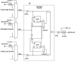 Źródłem nośnej może być wybierany programowo sygnał wyjściowy PWM, wyjście z modułu CCP lub wyjście wbudowanego układu CLC (Configurable Logic Cell). Podobnie jest w przypadku sygnałów modulujących. Źródłem sygnału modulującego są również wybierane programowo sygnały PWM, CCP i CCP oraz sygnał z wyjścia komparatora.
