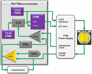 Modułu DSM można użyć do zbudowania specjalizowanej przetwornicy zasilającej diody LED o dużej mocy. Uproszczony schemat takiego układu zasilania pokazano na rysunku 5. Sygnał PWM o rozdzielczości 10-bitowej jest podawany na wejście COG.