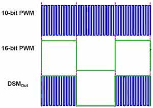 Kolejny nietypowy moduł peryferyjny to Data Signal Modulator - DSM. Umożliwia on miksowanie dwóch sygnałów cyfrowych. Przez analogię do modulacji fal radiowych, jeden z sygnałów o większej częstotliwości jest nazywany sygnałem nośnej (carrier signal), a drugi sygnałem modulującym (modulator signal).