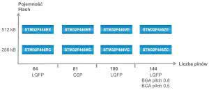 Warto także wspomnieć o pozostałych elementach wyposażenia prezentowanych układów, które doskonale ilustrują możliwości współczesnych mikrokontrolerów: wszystkie wersje F446 wyposażono w sprzętowe interfejsy kamer CCD (DCMI), wielokanałowe, szybkie przetworniki A/C i C/A o rozdzielczości 12 bitów, standardowym elementem wyposażenie jest także podsystem audio obsługujący protokoły I²S, LSB-/MSB-justified, PCM/DSP, TDM oraz AC’97.