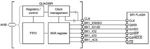 - Dwukanałowy interfejs QSPI (QuadSPI - rysunek 3), który jest zaawansowaną wersją interfejsu SPI, charakteryzująca się możliwością szeregowo-równoległego transferu danych za pomocą 1-/2- lub 4-bitowej magistrali danych, synchronizowanej za pomocą sygnału zegarowego. Za pomocą tego interfejsu mikrokontroler może obsługiwać m.in. pamięci NOR-Flash o pojemności do 256 MB z prędkością 90 MB/s w trybie SDR (taktowanie jednym zboczem) lub 120 MB/s w trybie DDR (taktowanie dwoma zboczami). Wbudowany w prezentowane mikrokontrolery interfejs QSPI umożliwia także jednoczesną obsługę dwóch pamięci Flash - jego konfigurację w tym trybie pracy pokazano na rysunku 4.
