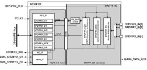 - 4-kanałowy interfejs SPDIF (IEC-60958, IEC-61937) zintegrowany z dekoderem odbieranych danych, automatyczną detekcją prędkości transmisji (częstotliwości próbkowania sygnału audio) i możliwością obsługi sygnałów Dolby lub DTS w konfiguracji do 5.1 włącznie. Schemat blokowy tego interfejsu pokazano na rysunku 5.