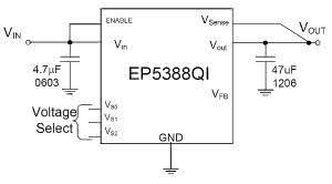 W miniaturowej obudowie producent zintegrował wszystkie elementy przetwornicy, łącznie z dławikiem i końcówką mocy, co pozwoliło uprościć schemat aplikacyjny tego układu do pokazanego na rysunku 4. Za pomocą zmiany stanów na wejściach VS2..VS0 można ustalać wartość napięcia wyjściowego w krokach: 0,8/1,2/1,25/1,5/1,8/2,5/3,3 V, a w razie potrzeby - za pomocą dzielnika rezystorowego - można ustalić dowolną wartość napięcia wyjściowego z zakresu 0,6...4,5 VDC.