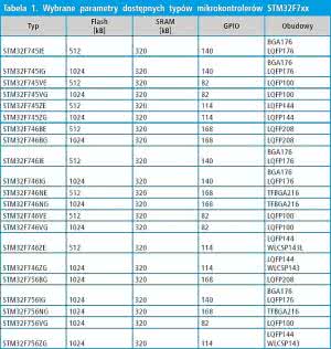 W tabeli 1 zestawiono wybrane informacje o cechach i parametrach dostępnych typów mikrokontrolerów STM32F7. Przedstawione dane pochodzą z początku lipca 2015, w tym czasie dostępny było 19 typów mikrokontrolerów o statusie active, dostępnych w wielu różnych wersjach obudów - od BGA/CSP, po łatwe w montażu wersje LQFP.