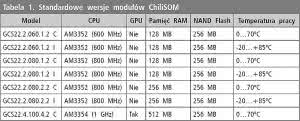 Moduł ChiliSOM jest aktualnie dostępny w wielu wersjach, z których standardowe zostały zebrane w tabeli 1. W wypadku zamówień specjalnych, producent może przygotować wersje z procesorami taktowanymi zegarem 300 MHz, 600 MHz, 800 MHz lub 1 GHz, wyposażone, w 128 MB, 256 MB lub 512 MB pamięci RAM oraz w 256 MB pamięci NAND Flash, lub jej pozbawione. Standardowo instalowany procesor to AM3352, ale możliwe jest też użycie procesorów AM3354, AM3356, AM3357, AM3358 lub AM3359.