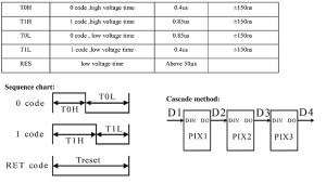Do takiej aplikacji niezbędny jest mechanizm, który umożliwi zmianę koloru świecenia pojedynczego piksela obrazu. Typowo diody łączy się w matryce i steruje nimi na przecięciu wierszy i kolumn, jeśli jednak w obudowie diody umieściliśmy kontroler, to "klasyczne" sterowanie nie ma sensu. Przecież naszym zamiarem było uniknięcie wykonywania nadmiernej liczby połączeń.