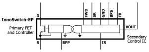 Układy InnoSwitch w czasie startu wykorzystują prąd pobierany ze źródła wysokiego napięcia, połączonego z drenem tranzystora kluczującego, eliminując konieczność stosowania zewnętrznych elementów startowych. Wykorzystanie uzwojenia pomocniczego, zmniejsza pobór mocy bez obciążenia i zwiększa wydajność systemu podczas normalnej pracy.