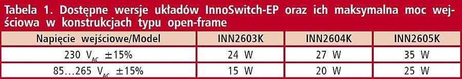 Tabela 1. Dostępne wersje układów InnoSwitch-EP oraz ich maksymalna moc wejściowa w konstrukcjach typu open-frame