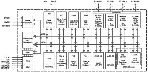Schemat blokowy układu mikrokontrolera MSP430FR4133 pokazano na rysunku 1. Duża elastyczność GPIO, dostępne obudowy TSSOP ułatwiają aplikację procesorów i typowych wyświetlaczy segmentowych LCD. Bogate wyposażenie procesora FR4133 umożliwia tworzenie aplikacji o znacznie większym stopniu komplikacji niż dla najsilniejszych procesorów z linii G2, w tym np. wszelkiego rodzaju inteligentnych układów pomiarowych wykorzystujących wbudowany przetwornik AD i sterownik LCD.