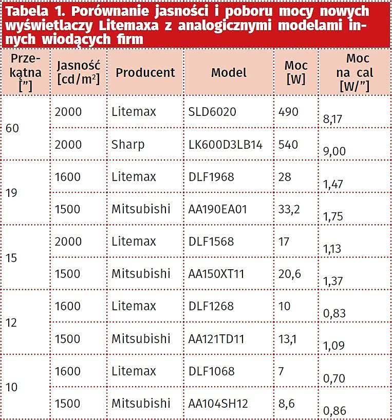 Tabela 1. Porównanie jasności i poboru mocy nowych wyświetlaczy Litemaxa z analogicznymi modelami innych wiodących firm