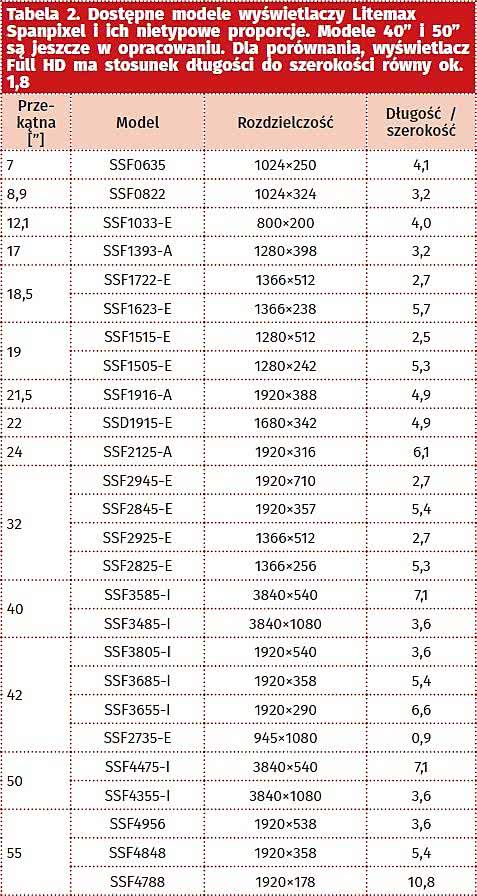 Tabela 2. Dostępne modele wyświetlaczy Litemax Spanpixel i ich nietypowe proporcje. Modele 40" i 50" są jeszcze w opracowaniu. Dla porównania, wyświetlacz Full HD ma stosunek długości do szerokości równy ok. 1,8