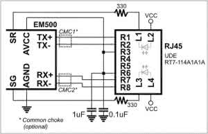 Pewną komplikacją w stosowaniu EM500 jest to, że wymaga zewnętrznego obwodu zerowania. Ponadto, producent rekomenduje użycie specjalizowanych układów resetu np. MCP130-300, co nie wpływa korzystnie na budżet projektu. Stosowanie zewnętrznego transformatora oraz gniazda RJ45 również wymaga nieco uwagi. Zgodnie zaleceniami połączenia pomiędzy modułem a elementami zewnętrznymi powinny być jak najkrótsze, co wymusza umiejscowienie modułu bardzo blisko gniazda. Port Ethernet jest zgodny ze standardem 10/100BaseT oraz auto-MDIX. Przykładowy schemat połączeń pokazano na rysunku 3.