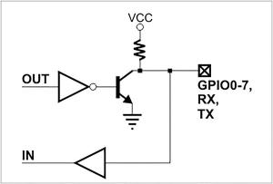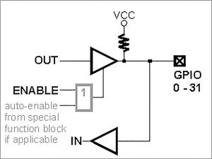 Standardowo wyprowadzenie portu może znajdować się w jednym z trzech stanów: z poziomem wysokim, z poziomem niskim lub w stanie wysokiej impedancji (w tym wypadku linia pracuje jako wejście). W praktyce oznacza to, że przy obsłudze jednej linii I/O musimy manipulować dwoma rejestrami: jednym odpowiedzialnym za kierunek linii, drugim za występujący na niej poziom. Tak zaprojektowane bufory linii wejściowych są w starszych (niż EM500) platformach (EM1202, EM1206, EM1000). Budowę takiego bufora pokazano na rysunku 4. Linia ENABLE jest odpowiedzialna za załączenie/wyłączenie drivera wyjścia (kontrolowanego przez linię OUT) przy przełączaniu trybu pracy. W module EM500 zastosowano inną budowę (rysunek 5). Bufor wyjściowy to tranzystor pracujący w układzie otwartego kolektora (niemalże otwartego - w obwodzie występuje rezystor podciągający o dużej rezystancji). Przy stosowaniu rozwiązań tego typu należy pamiętać o różnicach w wydajności prądowej. Dla trybu sink (poziom niski) port może przewodzić prąd o maksymalnym natężeniu 10 mA. Natomiast wydajność prądowa linii na poziomie wysokim jest znikoma, co wynika z dużej rezystancji opornika podciągajacego. Ograniczenie to pozwala jednak na pracę linii w charakterze wejścia - właśnie z uwagi na dużą oporność rezystora, który determinuje impedancję wejściową linii. Należy jednak pamiętać o tym, iż aby odczytać wartość logiczną przyłożoną do linii wejściowej, należy najpierw ustawić ją (a tym samym - otworzyć tranzystor).