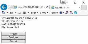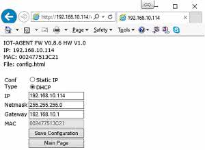 Jako dodatek Agent oferuje wbudowany interfejs WWW (dostępny z poziomu sieci lokalnej). Po wpisaniu w przeglądarce adresu IP agenta zostaniemy przeniesieni na stronę główną (rysunek 7). Dostępne są na niej informacje o adresie IP i MAC oraz trzy przyciski. Pierwszy z nich służy do przełączania stanów przekaźnika, drugi do przejścia do podstrony konfiguracyjnej Agenta (rysunek 8), trzeci do restartowania urządzenia. Na podstronie konfiguracyjnej możliwe jest przełączenie Agenta w tryb konfiguracji statycznej IP.