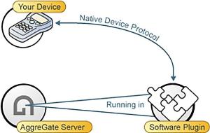 Jeśli urządzenie nie używa do komunikacji standardowego protokołu wówczas możemy nawiązać połącznie za pośrednictwem sterownika (działającego po stronie serwera), który może być używany przez serwer jako plug-in. Implementacja takiego sterownika leży wówczas po naszej stronie, jednak wciąż nie ma konieczności ingerencji w część sprzętową urządzenia, które chcemy dołączyć do systemu (rysunek 10).