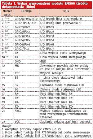 Wygląd EM500 zaprezentowano na rysunku 2. Wyprowadzenia zgrupowano w jednym 22-pionowym konektorze (wykaz wyprowadzeń umieszczono w tabeli 1). Moduł dysponuje 512 kB pamięci Flash, która jest dzielona pomiędzy aplikację użytkownika (320 kB) a system operacyjny TiOS (192 kB). Ponadto, moduł ma 208 bajtów pamięci EEPROM (głównie do przechowywania danych konfiguracyjnych). W EM500 pamięć ta nabiera szczególnego znaczenia, gdyż moduł nie ma funkcjonalności wewnętrznego dysku Flash. System operacyjny modułu EM500 udostępnia wprawdzie obiekt fd (będący sterownikiem dysku Flash), jednak może on współpracować jedynie z zewnętrznymi pamięciami z interfejsem SPI. Innymi słowy - pamięć EEPROM jest jedyną pamięcią nieulotną modułu, dostępną z poziomu aplikacji.