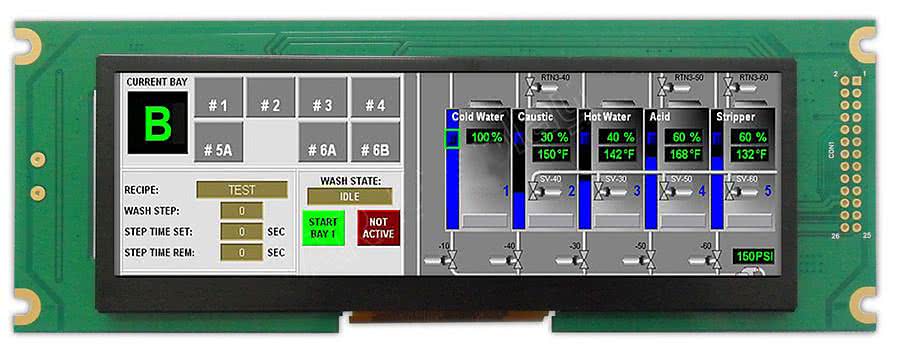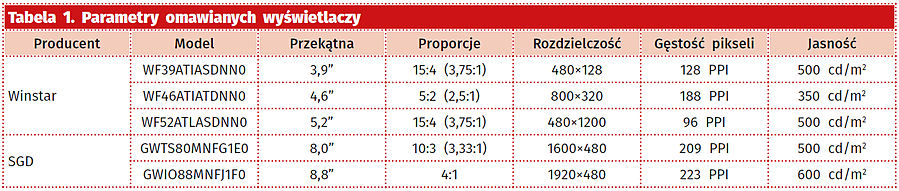 Firma Winstar wprowadziła do swojej oferty trzy modele wyświetlaczy panoramicznych o dużej szerokości, wykonanych w technologii LCD-TFT, o przekątnych 3,9”, 4,6” i 5,2”. Najmniejszy z nich to model WF39ATIASDNN0 o rozdzielczości 480x128 pikseli (proporcje 3,75:1). Jego wymiary zewnętrzne to: 105,5 mm×40,6 mm, a grubość wynosi 2,95 mm. Obszar aktywny jest niewiele mniejszy – 95,04 mm×25,34 mm, co oznacza, że upakowanie pikseli wynosi 128 PPI. Ekran jest oczywiście podświetlany diodami (10 LED), a jego powierzchnię pokryto warstwą antyrefleksyjną. Jego jasność wynosi 500 cd/m2.