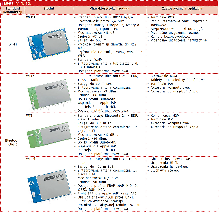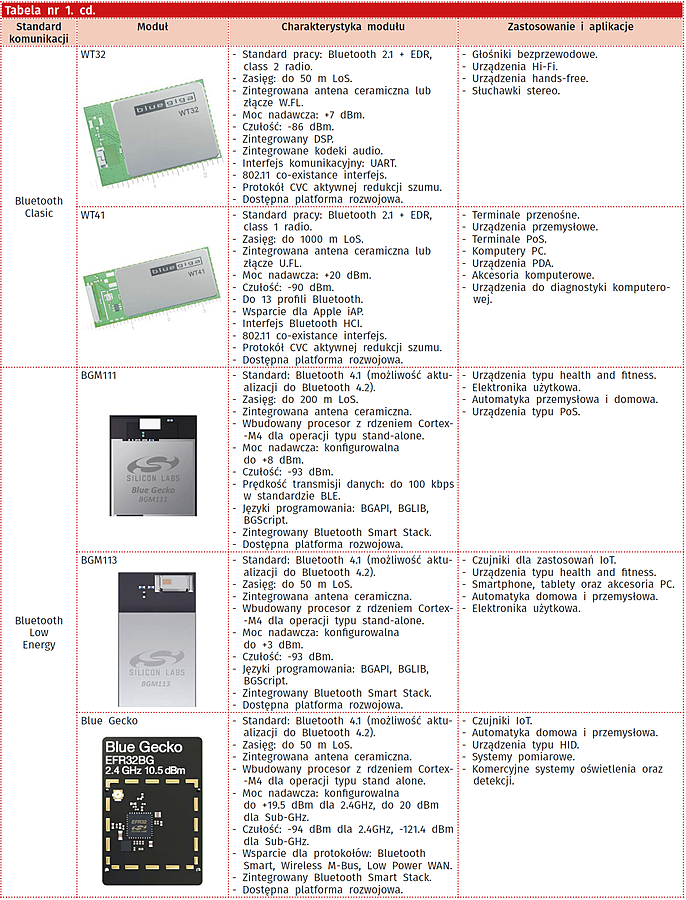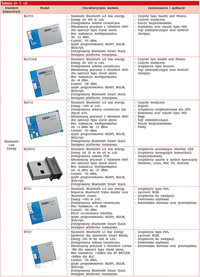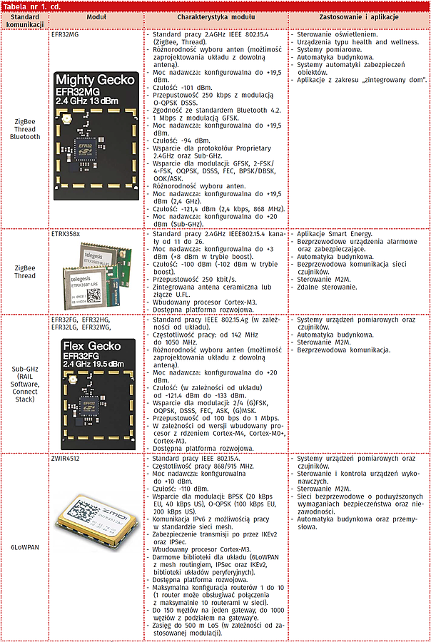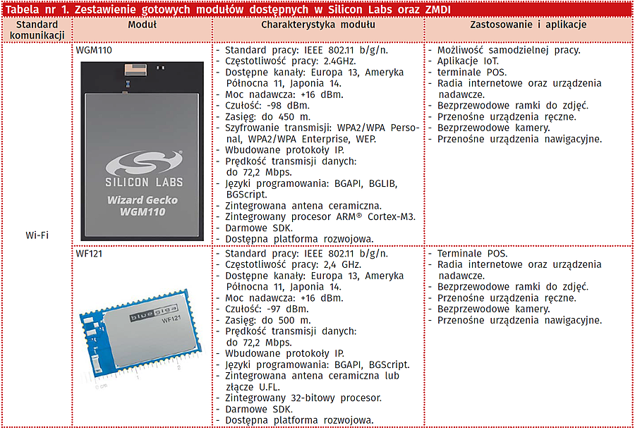 Firma Silicon Laboratories będąca jednym z producentów modułów oraz układów radiowych posiada szerokie portfolio produktów umożliwiające komunikację w większości z wymienionych standardów, po za standardowymi modułami Bluetooth, Wi-Fi, ZigBee, Thread czy Sub-GHz, producent posiada moduły służące do implementacji protokołu w wybranym standardzie. Implementacja wybranego protokołu nie musi ograniczać się do używania tego jednego standardu gdyż układy SoC będące sercem modułu dają możliwość implementacji oraz automatycznego przełączania pomiędzy zaimplementowanymi standardami, dodatkowo posiadają wbudowane bloki radiowe do obsługi również protokołów w paśmie Sub-GHz. W tabeli 1 wymieniono moduły komunikacyjne dostępne w Silicon Laboratories uwzględniając najważniejsze parametry zarówno samego układu, standardu komunikacji oraz kluczowych aplikacji zastosowania, w zestawieniu znalazł się jeden rodzynek dostępny od ZMDI (obecnie IDT).