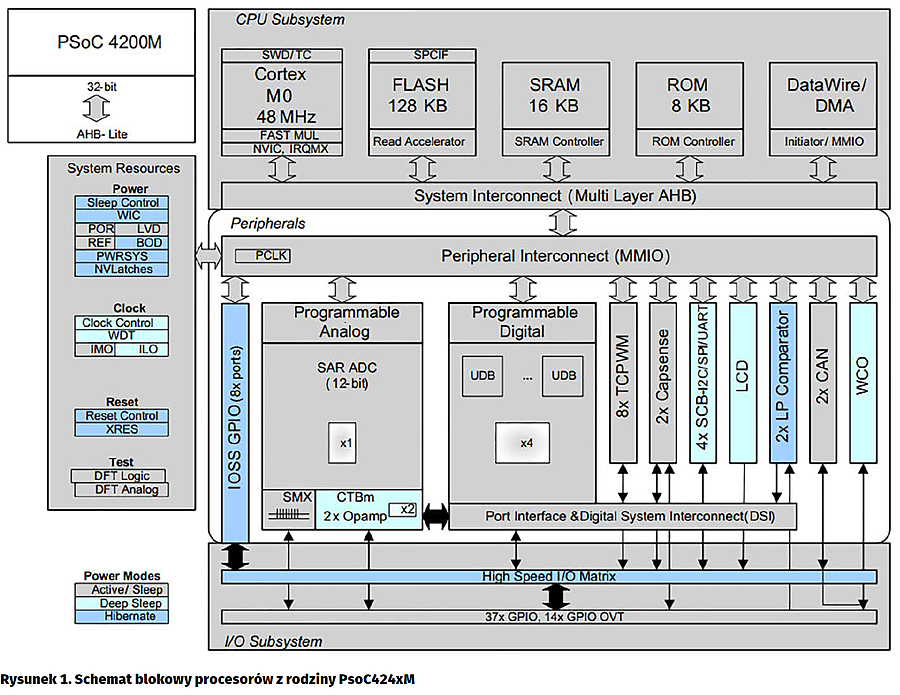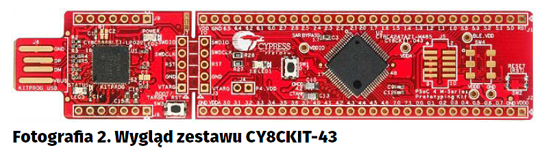 Jako wsparcie projektowe wprowadzono do oferty zestaw uruchomieniowy CY8CKIT-043 (fotografia 2), którego sercem jest układ CY8C4247AZI-M485 w obudowie TQFP64 oraz wbudowany programator/debugger Kit-Prog oparty na PSoC5.