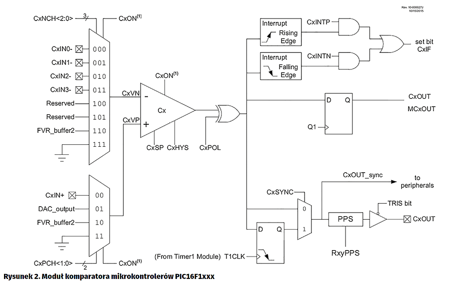 Typowy moduł komparatora zaimplementowany w mikrokontrolerach z rodziny PIC16F1xxx jest wyposażony w dwa multipleksery wejściowe (po jednym dla każdego wejścia), jak pokazano na rysunku 2. Napięcie wejściowe jest pobierane z wyprowadzeń mikrokontrolera, wyjścia modułu wewnętrznego napięcia referencyjnego FVR lub z wyjścia przetwornika C/A. Ten przetwornik, zależnie od typu mikrokontrolera, może być 5-, 8- lub 10-bitowy. Wynik porównania może być: