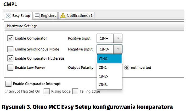 Nawet tak prosty w działaniu moduł wymaga skonfigurowania: trzeba wybrać sygnały wejściowe, ustalić polaryzację sygnału wyjściowego (wprost/zanegowany), skonfigurować polaryzację sygnału wyzwalania przerwania, włączyć lub wyłączyć histerezę przełączania, zaprogramować przypisanie wyjść sygnału CxOUT (moduł PPS) i w końcu włączyć moduł.