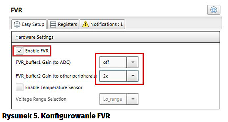 MCC generuje dwie funkcje: konfiguracyjną FVR_initialize() i zwracająca status FVR_IsOutputReady(). Pokazano je na listingu 2.