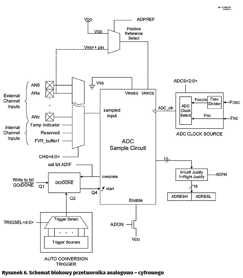 Kolejnym ważnym parametrem jest liczba wejść analogowych W naszym mikrokontrolerze może ich być 12. Poza tymi wejściami przetwornik może mierzyć napięcie z wyjścia AN1 przetwornika cyfrowo analogowego C/A, modułu pomiaru temperatury i modułu napięcia referencyjnego FVR_buffer_1.