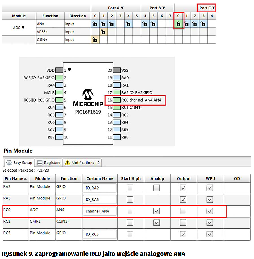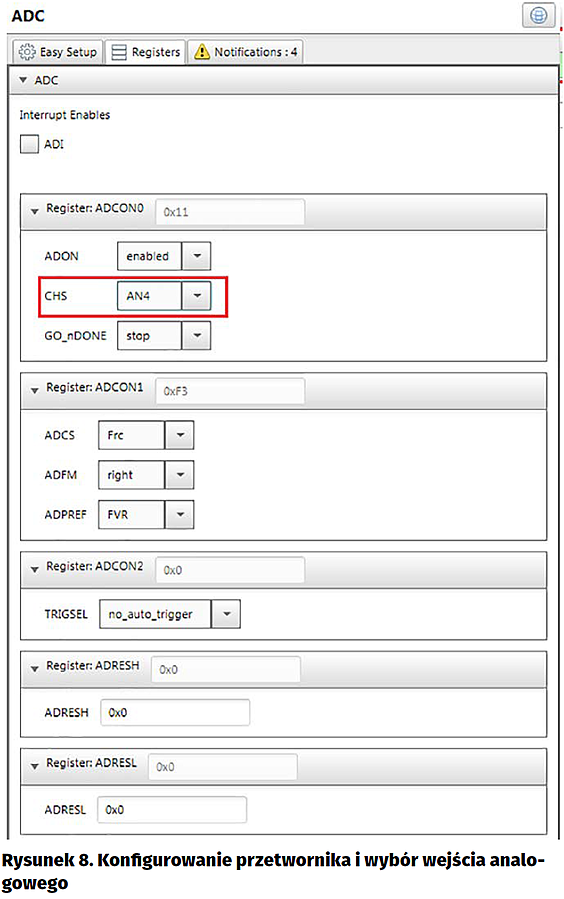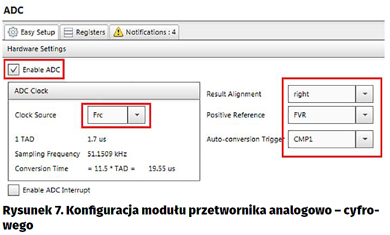 Konfigurowanie przetwornika poprzez MCC można podzielić na dwa etapy. Pierwszy z nich to konfiguracja modułu przetwornika, a drugi konfiguracja wejścia analogowego. Na rysunku 7 pokazano okno ADC Easy Setup. Wybieramy tu: włączenie modułu przetwornika (enable ADC), wybór zegara taktującego (clock source), sposób zapisania 10-bitowego wyniku konwersji w rejestrze 16-bitowym (dosunięty do lewej lub dosunięty do prawej) oraz sposób wyzwalania konwersji automatycznej (tu wyjście CMP1). Dodatkowo, można odblokować zgłaszanie przerwań od zdarzenia zakończenia konwersji. W zakładce ADC registers są powtórzone ustawienia z Easy Setup, ale można tu dodatkowo wybrać aktywne wejście analogowe. Oczywiście, kiedy nasza aplikacja tego wymaga, to program użytkownika może wybierać inne dostępne wejścia według potrzeb.
